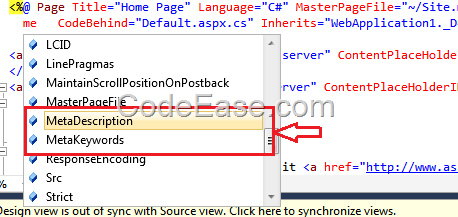 MetaDescription = "This is Description" MetaKeywords="ASP.NET" CodeBehind="Default.aspx.cs" Inherits="WebApplication1._Default"%>
